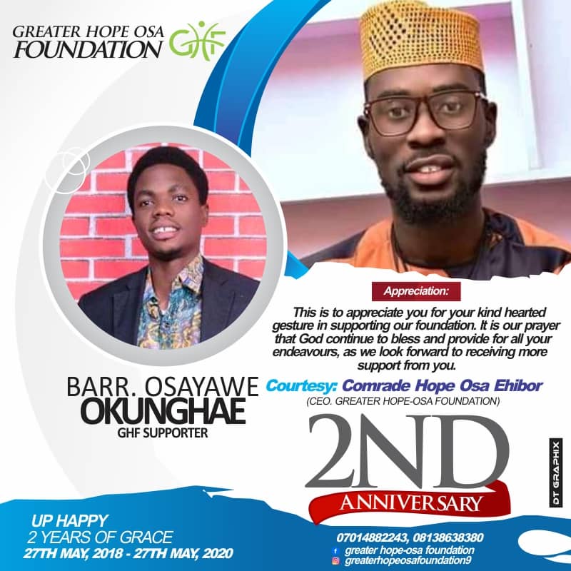 As we celebrate our 2 years anniversary we'll like to specially appreciate your absolute effort and support in propelling Greater Hope Osa Foundation dreams to its peak. We say thank you for your support in helping the indigents in our society.